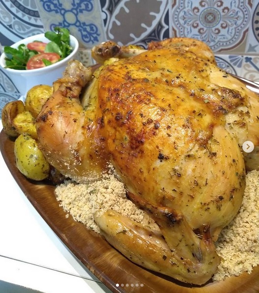 Depois, tire o alumínio, aumente a temperatura e deixe até ficar douradinho. As batatas são colocadas nessa etapa.