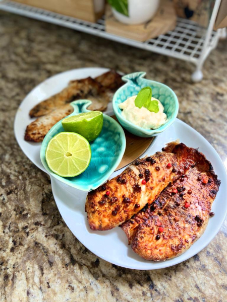 Tempere os Filés de Tilápia com azeite, sal e pimenta do reino. Em seguida, coloque o suco do limão e finalize com a pimenta rosa. Forre o fundo da fritadeira elétrica com papel alumínio, para evitar que o peixe agarre, e asse por mais ou menos 20 minutos.